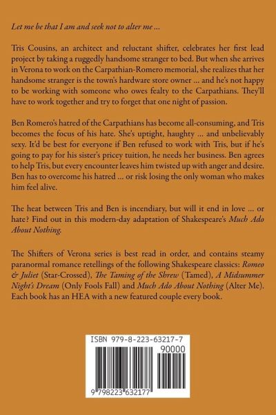 Let me be that I am and seek not to alter me … Tris Cousins, an architect and reluctant shifter, celebrates her first lead project by taking a ruggedly handsome stranger to bed. But when she arrives in Verona to work on the Carpathian-Romero memorial, she realizes that her handsome stranger is the town's hardware store owner … and he's not happy to be working with someone who owes fealty to the Carpathians. They'll have to work together and try to forget that one night of passion. Ben Romero's hatred of the Carpathians has become all-consuming, and Tris becomes the focus of his hate. She's uptight, haughty … and unbelievably sexy. It'd be best for everyone if Ben refused to work with Tris, but if he's going to pay for his sister's pricey tuition, he needs her business. Ben agrees to help Tris, but every encounter leaves him twisted up with anger and desire. Ben has to overcome his hatred … or risk losing the only woman who makes him feel alive. The heat between Tris and Ben is incendiary, but will it end in love … or hate? Find out in this modern-day adaptation of Shakespeare's Much Ado About Nothing. The Shifters of Verona series is best read in order, and contains steamy paranormal romance retellings of the following Shakespeare classics: Romeo & Juliet (Star-Crossed), The Taming of the Shrew (Tamed), A Midsummer Night's Dream (Only Fools Fall) and Much Ado About Nothing (Alter Me). Each book has an HEA with a new featured couple every book.