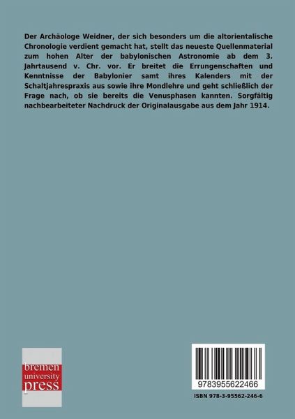 Der Archäologe Weidner, der sich besonders um die altorientalische Chronologie verdient gemacht hat, stellt das neueste Quellenmaterial zum hohen Alter der babylonischen Astronomie ab dem 3. Jahrtausend v. Chr. vor. Er breitet die Errungenschaften und Kenntnisse der Babylonier samt ihres Kalenders mit der Schaltjahrespraxis aus sowie ihre Mondlehre und geht schließlich der Frage nach, ob sie bereits die Venusphasen kannten. Sorgfältig nachbearbeiteter Nachdruck der Originalausgabe aus dem Jahr 1914.