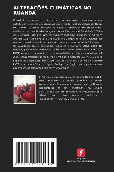 O estudo centra-se nos impactos das alterações climáticas e nas estratégias locais de adaptação na comunidade rural do distrito de Rusizi, no Ruanda. Utilizando métodos de deteção remota, foram processadas, analisadas e classificadas imagens de satélite Landsat TM 4-5 de 2005 e 2015 retiradas do sítio Web eartexplorer.usgs.govs utilizando o software ARC GIS 10.3. A entrevista, o pré-inquérito e o inquérito foram apoiados por um questionário enviado a uma amostra representativa de 106 indivíduos. Os resultados foram codificados utilizando o software EXCEL 2010. No entanto, para o tratamento dos dados qualitativos utilizou-se o SWOT (ou MOFF) e para o tratamento dos dados estatísticos utilizou-se o software R 2.15.1 para comparar as frequências médias, o software XLSTAT 2016 para separar as frequências médias ao nível de significância de 5% e o software PAST 3.14 para efetuar a regressão logística (logit) dos impactos e das adaptações às alterações climáticas encontradas...