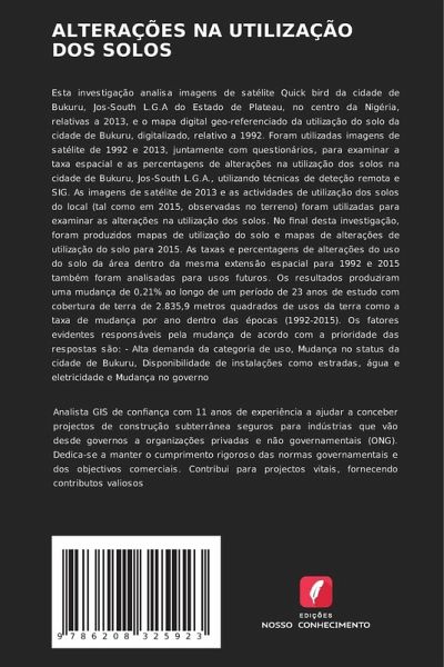 Esta investigação analisa imagens de satélite Quick bird da cidade de Bukuru, Jos-South L.G.A do Estado de Plateau, no centro da Nigéria, relativas a 2013, e o mapa digital geo-referenciado da utilização do solo da cidade de Bukuru, digitalizado, relativo a 1992. Foram utilizadas imagens de satélite de 1992 e 2013, juntamente com questionários, para examinar a taxa espacial e as percentagens de alterações na utilização dos solos na cidade de Bukuru, Jos-South L.G.A., utilizando técnicas de deteção remota e SIG. As imagens de satélite de 2013 e as actividades de utilização dos solos do local (tal como em 2015, observadas no terreno) foram utilizadas para examinar as alterações na utilização dos solos. No final desta investigação, foram produzidos mapas de utilização do solo e mapas de alterações de utilização do solo para 2015. As taxas e percentagens de alterações do uso do solo da área dentro da mesma extensão espacial para 1992 e 2015 também foram analisadas para usos futuros. Os resultados produziram uma mudança de 0,21% ao longo de um período de 23 anos de estudo com cobertura de terra de 2.835,9 metros quadrados de usos da terra como a taxa de mudança por ano dentro das épocas (1992-2015). Os fatores evidentes responsáveis pela mudança de acordo com a prioridade das respostas são: - Alta demanda da categoria de uso, Mudança no status da cidade de Bukuru, Disponibilidade de instalações como estradas, água e eletricidade e Mudança no governo