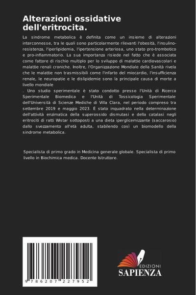 La sindrome metabolica è definita come un insieme di alterazioni interconnesse, tra le quali sono particolarmente rilevanti l'obesità, l'insulino-resistenza, l'iperlipidemia, l'ipertensione arteriosa, uno stato pro-trombotico e pro-infiammatorio. La sua importanza risiede nel fatto che è associata come fattore di rischio multiplo per lo sviluppo di malattie cardiovascolari e malattie renali croniche. Inoltre, l'Organizzazione Mondiale della Sanità rivela che le malattie non trasmissibili come l'infarto del miocardio, l'insufficienza renale, le neuropatie e le dislipidemie sono la principale causa di morte a livello mondiale. Uno studio sperimentale è stato condotto presso l'Unità di Ricerca Sperimentale Biomedica e l'Unità di Tossicologia Sperimentale dell'Università di Scienze Mediche di Villa Clara, nel periodo compreso tra settembre 2019 e maggio 2023. È stato inquadrato nella determinazione dell'attività enzimatica della superossido dismutasi e della catalasi negli eritrociti di ratti Wistar sottoposti a una dieta iperglicemizzante (saccarosio) dallo svezzamento all'età adulta, stabilendo così un biomodello della sindrome metabolica.