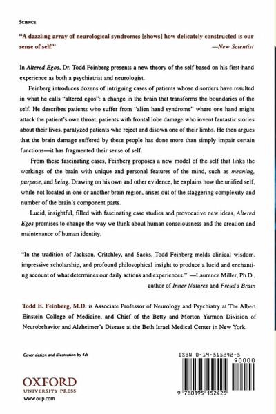 In Altered Egos, Dr. Todd Feinberg presents a new theory of the self based on his first-hand experience as both a psychiatrist and neurologist. Feinberg introduces dozens of intriguing cases of patients whose disorders have resulted in what he calls "altered egos": a change in the brain that transforms the boundaries of the self. He describes patients who suffer from "alien hand syndrome" where one hand might attack the patient's own throat, patients with frontal lobe damage who invent fantastic stories about their lives, paralyzed patients who reject and disown one of their limbs. He then argues that the brain damage suffered by these people has done more than simply impair certain functions--it has fragmented their sense of self. From these fascinating cases, Feinberg proposes a new model of the self that links the workings of the brain with unique and personal features of the mind, such as meaning, purpose, and being. Drawing on his own and other evidence, he explains how the unified self, while not located in one or another brain region, arises out of the staggering complexity and number of the brain's component parts. Lucid, insightful, filled with fascinating case studies and provocative new ideas, Altered Egos promises to change the way we think about human consciousness and the creation and maintenance of human identity.