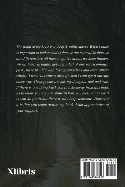 The point of my book is to help & uplift others. What I think is important to understand is that we are more alike than we are different. We all have negative habits we keep hidden. We all hurt, struggle, get reminded of our shortcomings/past , have trouble with loving ourselves and even others wholly. I write to express myself when I cant get it out any other way. These poems are me, my thoughts, real and true. If there is one thing I ask you to take away from this book its to know you are not alone in how you feel. Whatever it is you do put it out there it may help someone. However it is that you came across my book. I am appreciative of your support.