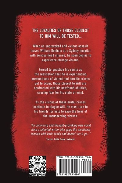 THE LOYALTIES OF THOSE CLOSEST TO HIM WILL BE TESTED... When an unprovoked and vicious assault leaves William Denham at a Sydney hospital with serious head injuries, he soon begins to experience strange visions. Forced to question his sanity as the realisation that he is experiencing premonitions of violent and horrific crimes yet to occur, those closest to Will are confronted with his newfound abilities, causing fear for his state of mind. As the visions of these brutal crimes continue to plague Will, he must turn to his friends for help to save the lives of the unsuspecting victims... "An unnerving and thought-provoking new novel from a talented writer who grips the emotional tension with both hands and doesn't let it go..." Trevor, Indie Book reviewer