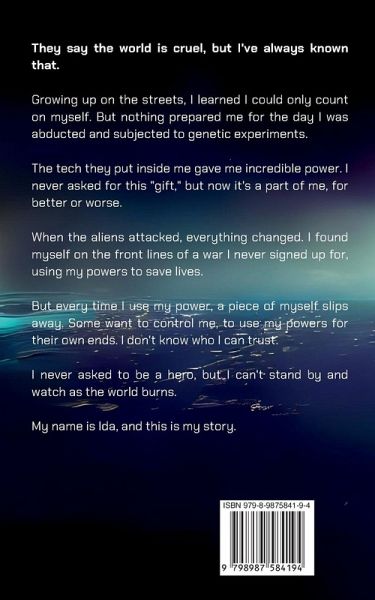 They say the world is cruel, but I've always known that. Growing up on the streets, I learned I could only count on myself. But nothing prepared me for the day I was abducted and subjected to genetic experiments. I soon discovered the tech they put inside me gave me incredible power. I never asked for this "gift," but now it's a part of me, for better or worse. When the aliens attacked, everything changed. They call them the Heavies, and they're unlike anything I've ever seen. I found myself on the front lines of a war I never signed up for, using my powers to save lives. But every time I use my power, a piece of myself slips away. Some want to control me, to use my powers for their own ends. I don't know who I can trust anymore. I never asked to be a hero, but I can't stand by and watch as the world burns. I have to keep fighting, even if it means sacrificing everything I am. My name is Ida, and this is my story. Fans of resilient heroines and harrowing quests for freedom, reminiscent of The Hunger Games, Divergent, and Shatter Me, will love Ida's courageous journey of rebellion and self-discovery. Book 1 in a four-book YA Sci-fi dystopian series.
