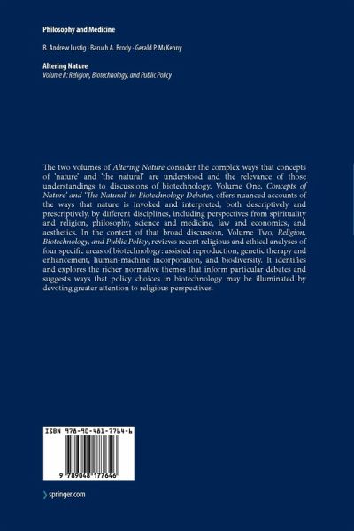 B. Andrew Lustig, Baruch A. Brody, and Gerald P. McKenny In this second volume of the "Altering Nature" project, we situate specific religious and policy discussions of four broad areas of biotechnology within the context of our interdisciplinary research on concepts of nature and the natural in the first volume (Altering Nature, Concepts of Nature and the Natural in Biotechnology Debates). In the first volume, we invited five groups of scholars to explore the diverse conc- tions of nature and the natural that shape moral judgments about human alterations of nature, as especially exemplified by recent developments in biotechnology. A careful reading of such developments reveals that assessments of them-whether positive or negative-are often informed by different conceptual interpretations of nature and the natural, with differing implications for judgments about the app- priateness of particular alterations of nature. These varying interpretations of nature and the natural often result from the distinctive perspectives that characterize va- ous scholarly disciplines. Therefore, in an effort to explore the variety of meanings that attend discussions of the concepts of nature and the natural, the contributors to the first volume of Altering Nature addressed those concepts from five different disciplinary vantages. A first group of scholars analyzed a range of religious and spiritual perspectives on concepts of nature and the natural. Their research highlighted the thematic, h- torical, and methodological touchstones in those traditions that shape their persp- tives on nature.