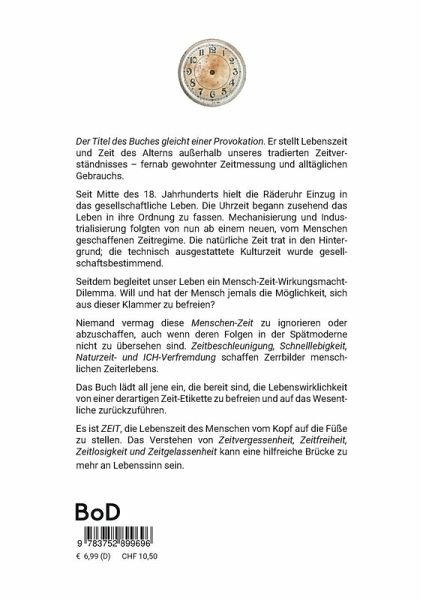 Der Titel des Buches gleicht einer Provokation. Er stellt Lebenszeit und Zeit des Alterns außerhalb unseres tradierten Zeitverständnisses, fernab gewohnter Zeitmessung und alltäglichen Gebrauchs.Seit Mitte des 18. Jahrhunderts hielt die Räderuhr Einzug in das gesellschaftliche Leben. Die Uhrzeit begannt zusehends das Leben in ihre Ordnung zu fassen. Mechanisierung und Industrialisierung folgten von nun ab einem neuen, vom Menschen geschaffenen Zeitregime. Die natürliche Zeit trat in den Hintergrund; die technisch ausgestattete Kulturzeit wurde gesellschaftsbestimmend.Seitdem begleitet unser Leben ein Mensch-Zeit-Wirkungsmacht-Dilemma. Will und hat der Mensch je die Möglichkeit, sich aus dieser Klammer zu befreien?Niemand vermag diese Menschen-Zeit zu ignorieren oder abzuschaffen, auch wenn deren Folgen in der Spätmodernen nicht zu übersehen sind. Zeitbeschleunigung, Schnelllebigkeit, Naturzeit- und ICH-Verfremdung schaffen Zerrbilder menschlichen Zeiterlebens.Das Buch lädt all´ jene ein, die bereit sind, die Lebenswirklichkeit von einer derartigen Zeit-Etikette zu befreien und sie auf das Wesentliche zurückzuführen.Es ist ZEIT, die Lebenszeit des Menschen vom Kopf auf die Füße zu stellen. Das Verstehen von Zeitvergessenheit, Zeitfreiheit, Zeitlosigkeit und Zeitgelassenheit kann eine hilfreiche Brücke zu einem Mehr an Lebenssinn sein.