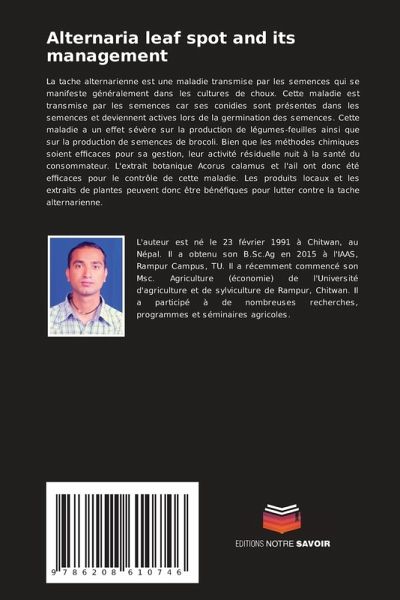 La tache alternarienne est une maladie transmise par les semences qui se manifeste généralement dans les cultures de choux. Cette maladie est transmise par les semences car ses conidies sont présentes dans les semences et deviennent actives lors de la germination des semences. Cette maladie a un effet sévère sur la production de légumes-feuilles ainsi que sur la production de semences de brocoli. Bien que les méthodes chimiques soient efficaces pour sa gestion, leur activité résiduelle nuit à la santé du consommateur. L'extrait botanique Acorus calamus et l'ail ont donc été efficaces pour le contrôle de cette maladie. Les produits locaux et les extraits de plantes peuvent donc être bénéfiques pour lutter contre la tache alternarienne.