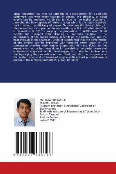 Many researches had tried on Jatropha as a replacement for diesel and confirmed that with minor changes in engine, the efficiency of diesel engine can be improved marginally. But due to the higher viscosity of Jatropha, the flow capacity of Jatropha is less which is the major drawback for increasing the efficiency of engine. To overcome this flow problem, in the present work it is planned to work with nano fluids. Further the work is planned with B20 for varying the proportion of Al2O3 nano fluids (50,100 and 150ppm) with blending of Jatropha biodiesel. The performance of the engine majorly depends on the combustion and the heat available in the chamber. Further it is confirmed that the performance of the engine can be improved with Grooved piston insert in the combustion chamber with various proportions of nano fluids. In this experimental works has been done for calculating the performance and emissions of single cylinder DI diesel engine with Jatropha biodiesel as a fuel by varying the proportion of nano fluid, and also the comparison of the performance and emissions of engine with normal piston(aluminum piston) to the replaced piston(RGP6 piston) has done.