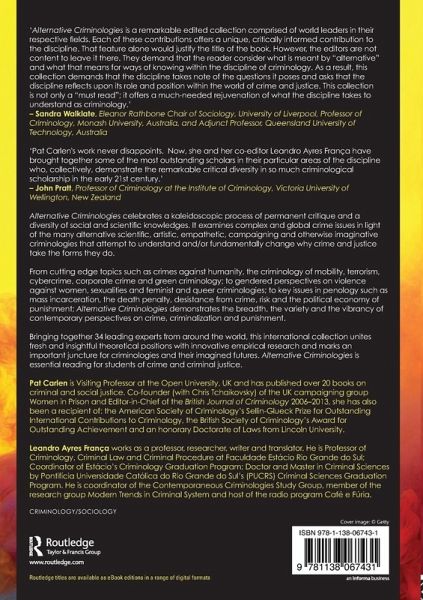 Part I: Theoretical perspectives 1. Alternative criminologies: an introduction Pat Carlen 2. Cultural criminologies continued Jeff Ferrell and Keith Hayward 3. Criminologies of the market Elliott Currie 4. Punishment and political economy Allessandro De Giorgi 5. Governing through crime Jonathon Simon and Giane Silvestre 6. Criminology and consumerism Simon Winlow and Steve Hall 7. Feminist criminologies Kerry Carrington 8. Queer criminology Clara Moura Masiero 9. The politics of sexuality: alternative visions of sex and social change Jo Phoenix 10. The criminology of mobility Sharon Pickering Mary Bosworth and Katja Franko 11. Green criminologies Reece Walters 12. Cyber-criminologies Leandro Ayres França Part II: Critical issues for the 21st century 13. Crime and media Eamonn Carrabine 14. Crime and risk Pat O'Malley 15. The criminal pursuit of serious white-collar crimes Michael Levi 16. Hate crimes Stevie-Jade Hardy and Neil Chakraborti 17. Criminology and terrorism: toward a critical approach Gabe Mythen 18. Violence against women Nicole Westmarland 19. Atrocity: the Latin American experience Susanne Karstedt 20. Crimes against humanity and war crimes Jos¿ Carlos Portella Jr 21. The challenge of state crime Penny Green 22. Mass incarceration David Brown 23. Prisoner reentry as myth and ceremony Löc Wacquant 24. Towards the global elimination of the death penalty: a cruel inhuman and degrading punishment Roger Hood and Carolyn Hoyle 25. Peculiar institution: America's death penalty today David Garland 26. Desistance: envisioning futures Hannah Graham and Fergus McNeill 27. Alternative criminologies corporatism and academic markets Pat Carlen and Jo Phoenix