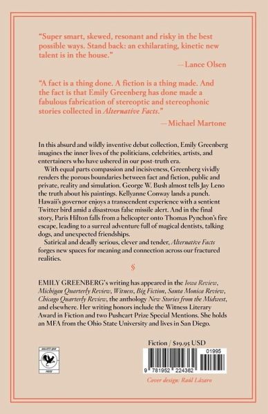 In this absurd and wildly inventive debut collection, Emily Greenberg imagines the inner lives of the politicians, celebrities, artists, and entertainers who have ushered in our post-truth era. With equal parts compassion and incisiveness, Greenberg vividly renders the porous boundaries between fact and fiction, public and private, reality and simulation. George W. Bush almost tells Jay Leno the truth about his paintings. Kellyanne Conway lands a punch. Hawaii's governor enjoys a transcendent experience with a sentient Twitter bird amid a disastrous false missile alert. And in the final story, Paris Hilton falls from a helicopter onto Thomas Pynchon's fire escape, leading to a surreal adventure full of magical dentists, talking dogs, and unexpected friendships. Satirical and deadly serious, clever and tender, Alternative Facts forges new spaces for meaning and connection across our fractured realities.