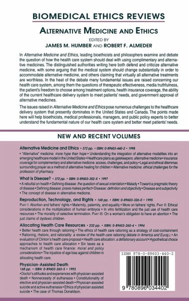 Leading bioethicists and philosophers examine and debate the question of how the health care system should deal with using complimentary and alternative medicines. The distinguished authorities writing here both defend and criticize alternative medicine, with some arguing that the medical system should change substantially in order to accommodate alternative medicine, and others claiming that virtually all alternative treatments are worthless. In the heat of the debate many fundamental issues are raised concerning our health care system, among them the questions of therapeutic effectiveness, media truthfulness, the patient's freedom to choose among treatment options, health insurance coverage, the ability of the current healthcare delivery system to meet patients' needs, and government approval of alternative medicines.