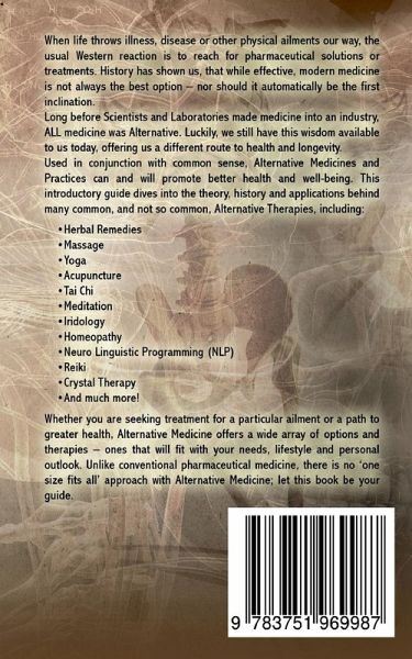 When life throws illness, disease or other physical ailments our way, the usual Western reaction is to reach for pharmaceutical solutions or treatments. History has shown us, that while effective, modern medicine is not always the best option - nor should it automatically be the first inclination.Long before Scientists and Laboratories made medicine into an industry, ALL medicine was Alternative. Luckily, we still have this wisdom available to us today, offering us a different route to health and longevity. Used in conjunction with common sense, Alternative Medicines and Practices can and will promote better health and well-being. This introductory guide dives into the theory, history and applications behind many common, and not so common, Alternative Therapies, including:_ Herbal Remedies_ Massage_ Yoga_ Acupuncture_ Tai Chi_ Meditation_ Iridology_ Homeopathy_ Neuro Linguistic Programming (NLP)_ Reiki_ Crystal Therapy_ And much more!Whether you are seeking treatment for a particular ailment or a path to greater health, Alternative Medicine offers a wide array of options and therapies - ones that will fit with your needs, lifestyle and personal outlook. Unlike conventional pharmaceutical medicine, there is no'one size fits all'approach with Alternative Medicine; let this book be your guide.