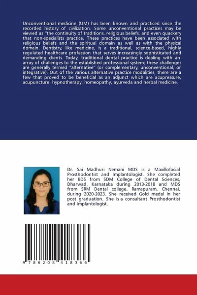 Unconventional medicine (UM) has been known and practiced since the recorded history of civilization. Some unconventional practices may be viewed as "the continuity of traditions, religious beliefs, and even quackery that non-specialists practice. These practices have been associated with religious beliefs and the spiritual domain as well as with the physical domain. Dentistry, like medicine, is a traditional, science-based, highly regulated healthcare profession that serves increasingly sophisticated and demanding clients. Today, traditional dental practice is dealing with an array of challenges to the established professional system; these challenges are generally termed "alternative" (or complementary, unconventional, or integrative). Out of the various alternative practice modalities, there are a few that proved to be beneficial as an adjunct which are acupressure, acupuncture, hypnotherapy, homeopathy, ayurveda and herbal medicine.