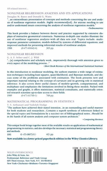 Of related interest Nonlinear Regression Analysis and its Applications Douglas M. Bates and Donald G. Watts " an extraordinary presentation of concepts and methods concerning the use and analysis of nonlinear regression models highly recommend[ed] for anyone needing to use and/or understand issues concerning the analysis of nonlinear regression models." --Technometrics This book provides a balance between theory and practice supported by extensive displays of instructive geometrical constructs. Numerous in-depth case studies illustrate the use of nonlinear regression analysis--with all data sets real. Topics include: multi-response parameter estimation; models defined by systems of differential equations; and improved methods for presenting inferential results of nonlinear analysis. 1988 (0-471-81643-4) 365 pp. Nonlinear Regression G. A. F. Seber and C. J. Wild " [a] comprehensive and scholarly work impressively thorough with attention given to every aspect of the modeling process " --Short Book Reviews of the International Statistical Institute In this introduction to nonlinear modeling, the authors examine a wide range of estimation techniques including least squares, quasi-likelihood, and Bayesian methods, and discuss some of the problems associated with estimation. The book presents new and important material relating to the concept of curvature and its growing role in statistical inference. It also covers three useful classes of models --growth, compartmental, and multiphase --and emphasizes the limitations involved in fitting these models. Packed with examples and graphs, it offers statisticians, statistical consultants, and statistically oriented research scientists up-to-date access to their fields. 1989 (0-471-61760-1) 768 pp. Mathematical Programming in Statistics T. S. Arthanari and Yadolah Dodge "The authors have achieved their stated intention in an outstanding and useful manner for both students and researchers Contains a superb synthesis of references linked to the special topics and formulations by a succinct set of bibliographical notes Should be in the hands of all system analysts and computer system architects." --Computing Reviews This unique book brings together most of the available results on applications of mathematical programming in statistics, and also develops the necessary statistical and programming theory and methods. 1981 (0-471-08073-X) 413 pp.