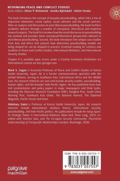 1. Introduction: Toward Bespoke Peacebuilding.- 2. Conceptualizing Bespoke Peacebuilding.- 3. "Peaces of the Puzzle": Mapping the Trajectories of Three Decades of Peacebuilding Scholarship.- 4. Bespoke Peacebuilding Through an International Quasi Leviathan: Bridging Basic Human Needs (BHNs) and Power.- 5. Violent Non-State Actors and Trust Building.- 6. A Holistic Peace: Buddhism and Liberal Peace.- 7. Contributions to Peacekeeping for Promotion of Localized Rwandan Norms.- 8. Controlling Violence by the Dominant Coalition: A Comparative Study of the Philippines (Mindanao) and Myanmar.- 9. Mediation as Peacebuilding: Faith-Based Mediators in Lesotho's Peacebuilding Process.- 10. The Lack of Trust in Failed Statebuilding: The Case of the Disarmament, Demobilization, and Reintegration (DDR) in Afghanistan.- 11. Conclusion.