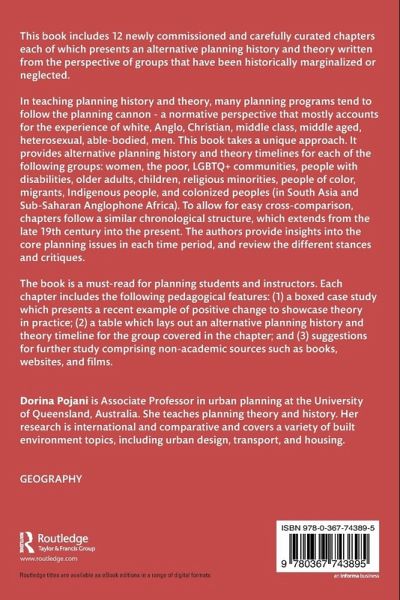 In teaching planning history and theory, many planning programs tend to follow the planning cannon - a normative perspective that mostly accounts for the experience of white, Anglo, Christian, middle class, middle aged, heterosexual, able-bodied, men. This book takes a unique approach. It provides alternative planning history and theory timelines for each of the following groups: women, the poor, LGBTQ+ communities, people with disabilities, older adults, children, religious minorities, people of color, migrants, Indigenous people, and colonized peoples (in South Asia and Sub-Saharan Anglophone Africa). To allow for easy cross-comparison, chapters follow a similar chronological structure, which extends from the late 19th century into the present. The authors provide insights into the core planning issues in each time period, and review the different stances and critiques.