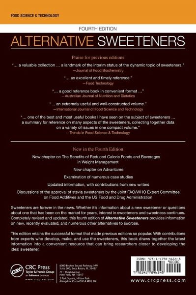The fourth edition of Alternative Sweeteners follows the same formula as the previous three books by discussing each sweetener in terms of its characteristics. Qualities covered include means of production, physical characteristics, utility, and relative sweetness (compared to sucrose). Technical qualities covered include admixture potential, application, availability, shelf life, transport, metabolism, carcinogenicity, and other toxicity evaluation data. A new chapter on the sweetener Advantame has been added, and new contributors have updated information throughout the book. Also new is a section on how Stevia sweeteners have been examined and deemed safe by the Joint FAO/WHO Expert Committee on Food Additives and the US FDA.