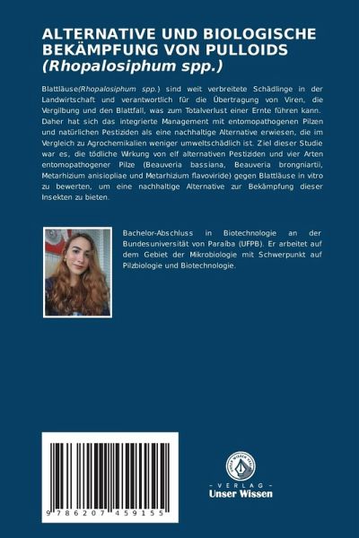 Blattläuse(Rhopalosiphum spp.) sind weit verbreitete Schädlinge in der Landwirtschaft und verantwortlich für die Übertragung von Viren, die Vergilbung und den Blattfall, was zum Totalverlust einer Ernte führen kann. Daher hat sich das integrierte Management mit entomopathogenen Pilzen und natürlichen Pestiziden als eine nachhaltige Alternative erwiesen, die im Vergleich zu Agrochemikalien weniger umweltschädlich ist. Ziel dieser Studie war es, die tödliche Wirkung von elf alternativen Pestiziden und vier Arten entomopathogener Pilze (Beauveria bassiana, Beauveria brongniartii, Metarhizium anisiopliae und Metarhizium flavoviride) gegen Blattläuse in vitro zu bewerten, um eine nachhaltige Alternative zur Bekämpfung dieser Insekten zu bieten.
