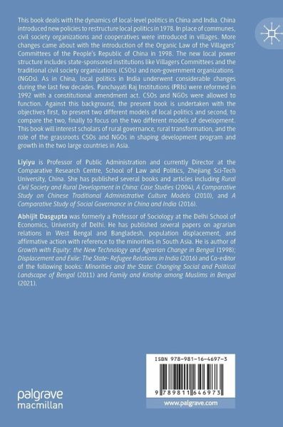 This book deals with the dynamics of local-level politics in China and India. China introduced new policies to restructure local politics in 1978. In place of communes, civil society organizations and cooperatives were introduced in villages. More changes came about with the introduction of the Organic Law of the Villagers' Committees of the People's Republic of China in 1998. The new local power structure includes state-sponsored institutions like Villagers Committees and the traditional civil society organizations (CSOs) and non-government organizations (NGOs). As in China, local politics in India undergoes considerable changes during the last few decades. Panchayati Raj Institutions (PRIs) were reformed in 1992 with a constitutional amendment act. CSOs and NGOs were allowed to function. Against this background, the present book is undertaken with the objectives first, to present two different models of local politics and second, to compare the two, finally to focus on the two different models of development. This book will interest scholars of rural governance, rural transformation, and the role of the grassroots CSOs and NGOs in shaping development program and growth in the two large countries in Asia.