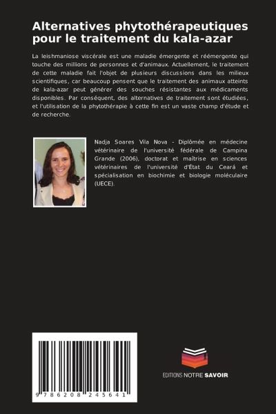 La leishmaniose viscérale est une maladie émergente et réémergente qui touche des millions de personnes et d'animaux. Actuellement, le traitement de cette maladie fait l'objet de plusieurs discussions dans les milieux scientifiques, car beaucoup pensent que le traitement des animaux atteints de kala-azar peut générer des souches résistantes aux médicaments disponibles. Par conséquent, des alternatives de traitement sont étudiées, et l'utilisation de la phytothérapie à cette fin est un vaste champ d'étude et de recherche.