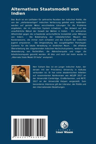 Das Buch ist ein Leitfaden für zahlreiche Facetten der indischen Politik, die von der "elefantenartigen" indischen Verfassung geleitet wird. Außerdem werden auf geniale Weise verschiedene Lösungen für die Probleme angeboten, die im indischen System schwären. - Die Antwort auf das unaufhörliche Rätsel der Gewalt bei Wahlen in Indien. - Ein wirksames Allheilmittel gegen die schwelende wirtschaftliche Instabilität unter Millionen von Indern. - Die Bekämpfung der mittelalterlichen Mauern des Kastenwesens, die immer noch schwelen und die Zukunft der indischen Jugend amputieren. - Die Umgestaltung des ausgeklügelten Panchayati-Systems für die lokale Verwaltung im ländlichen Raum. - Die effektive Überarbeitung des stagnierenden indischen Hochschulsystems, wodurch die Abwanderung von Fachkräften, die Abbrecherquote und sogar die Arbeitslosenquote gesenkt werden. All dies und noch viel mehr wurde im "Alternate State Model Of India" analysiert.