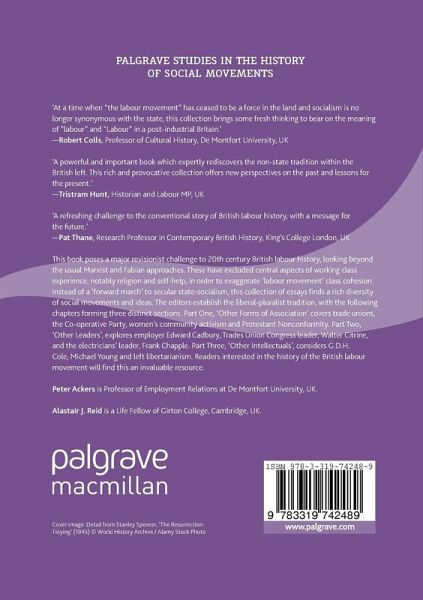 1. 'Other Worlds of Labour': liberal-pluralism in twentieth century British labour history Peter Ackers and Alastair J. Reid.- 2. Part I: Other forms of association.- 3. 2. Trade unions: voluntary associations and individual rights. Richard Whiting.- 4. 3. The Co-operative Party: an alternative vision of social ownership. Rachael Vorberg-Rugh and Angela Whitecross.- 5. 4. Working class women activists: citizenship at the local level. Ruth Davidson.- 6. 5. Protestant Nonconformists: providers of educational and social services. Andy Vail.- 7. Part II: Other leaders.- 8. 6. Edward Cadbury: an egalitarian employer and supporter of working women's campaigns. John Kimberley.- 9. 7. Walter Citrine: a union pioneer of industrial co-operation. James Moher.- 10. 8. Frank Chapple: a thoughtful trade union moderniser. Calum Aikman.- 11. Part III: Other intellectuals.- 12. 9. G.D.H. Cole: a socialist and pluralist. David Goodway.- 13. 10. Michael Young: an innovative social entrepreneur. Stephen Meredith.- 14. 11. The left after social democracy: towards state-society partnerships. Stuart White.- 15. 12. Looking forward: civil society after state socialism and beyond neo-liberalism. Peter Ackers and Alastair J. Reid.