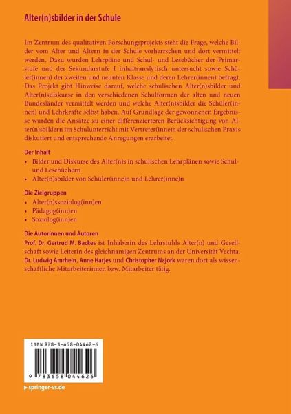 Im Zentrum des qualitativen Forschungsprojekts steht die Frage, welche Bilder vom Alter und Altern in der Schule vorherrschen und dort vermittelt werden. Dazu wurden Lehrpläne und Schul- und Lesebücher der Primarstufe und der Sekundarstufe I inhaltsanalytisch untersucht sowie Schüler(innen) der zweiten und neunten Klasse und deren Lehrer(innen) befragt. Das Projekt gibt Hinweise darauf, welche schulischen Alter(n)sbilder und Alter(n)sdiskurse in den verschiedenen Schulformen der alten und neuen Bundesländer vermittelt werden und welche Alter(n)sbilder die Schüler(innen) und Lehrkräfte selbst haben. Auf Grundlage der gewonnenen Ergebnisse wurden die Ansätze zu einer differenzierteren Berücksichtigung von Alter(n)sbildern im Schulunterricht mit Vertreter(inne)n der schulischen Praxis diskutiert und entsprechende Anregungen erarbeitet.