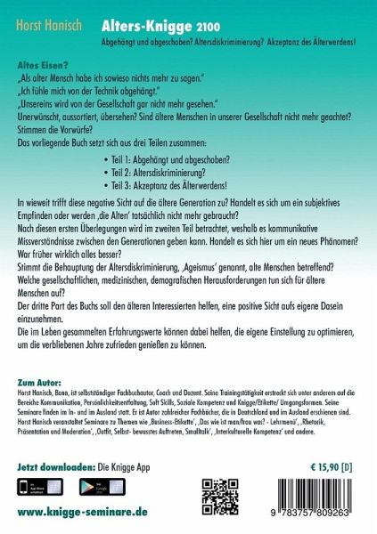 Altes Eisen? "Als alter Mensch habe ich sowieso nichts mehr zu sagen." "Ich fühle mich von der Technik abgehängt." "Unsereins wird von der Gesellschaft gar nicht mehr gesehen." Unerwünscht, aussortiert, übersehen? Sind ältere Menschen in unserer Gesellschaft nicht mehr geachtet?Stimmen die Vorwürfe? Das vorliegende Buch setzt sich aus drei Teilen zusammen:- Teil 1: Abgehängt und abgeschoben?- Teil 2: Altersdiskriminierung?- Teil 3: Akzeptanz des Älterwerdens!In wieweit trifft diese negative Sicht auf die ältere Generation zu? Handelt es sich um ein subjektives Empfinden oder werden 'die Alten' tatsächlich nicht mehr gebraucht?Nach diesen ersten Überlegungen wird im zweiten Teil betrachtet, weshalb es kommunikative Missverständnisse zwischen den Generationen geben kann. Handelt es sich hier um ein neues Phänomen? War früher wirklich alles besser?Stimmt die Behauptung der Altersdiskriminierung, 'Ageismus' genannt, alte Menschen betreffend?Welche gesellschaftlichen, medizinischen, demographischen Herausforderungen tun sich für ältere Menschen auf?Der dritte Part des Buchs soll den älteren Interessierten helfen, eine positive Sicht aufs eigene Dasein einzunehmen.Die im Leben gesammelten Erfahrungswerte können dabei helfen, die eigene Einstellung zu optimieren, um die verbliebenen Jahre zufrieden genießen zu können.