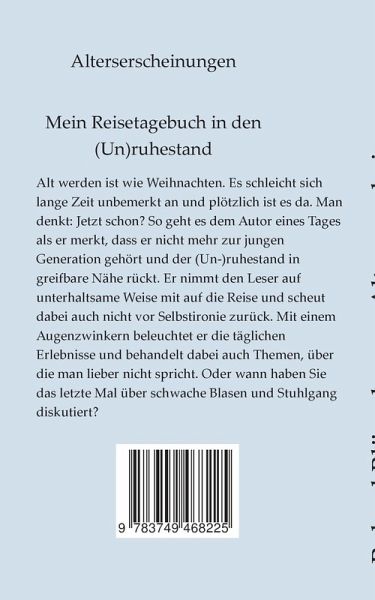 Alt werden ist wie Weihnachten. Es schleicht sich lange Zeit unbemerkt an und plötzlich ist es da. Man denkt: Jetzt schon? So geht es dem Autor eines Tages als er merkt, dass er nicht mehr zur jungen Generation gehört und der (Un-)ruhestand in greifbare Nähe rückt. Er nimmt den Leser auf unterhaltsame Weise mit auf die Reise und scheut dabei auch nicht vor Selbstironie zurück. Mit einem Augenzwinkern beleuchtet er die täglichen Erlebnisse und behandelt dabei auch Themen, über die man lieber nicht spricht. Oder wann haben Sie das letzte Mal über schwache Blasen und Stuhlgang diskutiert?