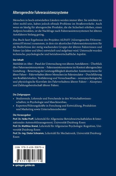 Das Buch fasst Ergebnisse des Projektes ALFASY (ALtersgerechte FAhrerassistenzSYsteme) zusammen, in dem ein akustisches Fahrerassistenzsystem für die Bedürfnisse der stetig wachsenden Gruppe der älteren Fahrerinnen und Fahrer (50 Jahre und älter) entwickelt und aufgebaut wird. Untersucht wurden technische, psychologische und betriebswirtschaftliche Aspekte.