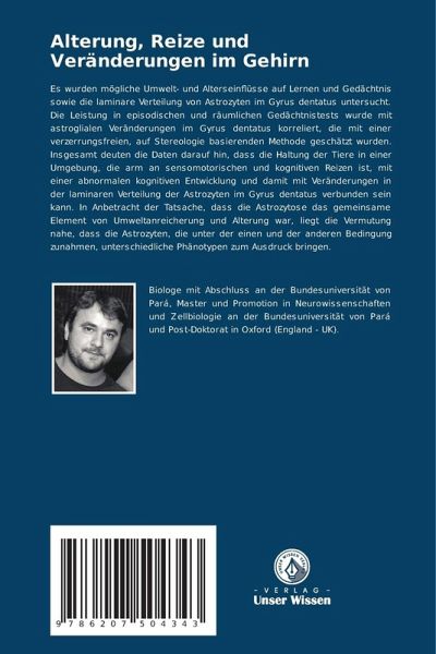 Es wurden mögliche Umwelt- und Alterseinflüsse auf Lernen und Gedächtnis sowie die laminare Verteilung von Astrozyten im Gyrus dentatus untersucht. Die Leistung in episodischen und räumlichen Gedächtnistests wurde mit astroglialen Veränderungen im Gyrus dentatus korreliert, die mit einer verzerrungsfreien, auf Stereologie basierenden Methode geschätzt wurden. Insgesamt deuten die Daten darauf hin, dass die Haltung der Tiere in einer Umgebung, die arm an sensomotorischen und kognitiven Reizen ist, mit einer abnormalen kognitiven Entwicklung und damit mit Veränderungen in der laminaren Verteilung der Astrozyten im Gyrus dentatus verbunden sein kann. In Anbetracht der Tatsache, dass die Astrozytose das gemeinsame Element von Umweltanreicherung und Alterung war, liegt die Vermutung nahe, dass die Astrozyten, die unter der einen und der anderen Bedingung zunahmen, unterschiedliche Phänotypen zum Ausdruck bringen.