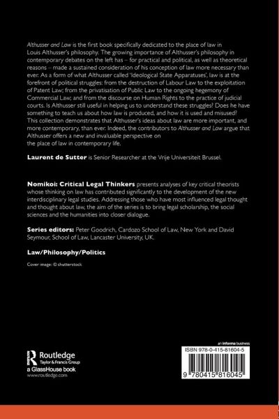 Introduction Laurent de Sutter; 1. The Threat of the Outside: Althusser's Reflections on Law Warren Montag; 2.Althusser on Laws Natural and Juridical William S. Lewis; 3. Monarchy Despotism and Althusser's 'Linguistic Trick': Materialist Reflections on the Literary Reproduction of Montesquieu's 'Fundamental Law' David McInerney; 4. Althusser's Paradoxical Legel Exceptionalism as a Materialist Critique of Schmitt's Decisionism Juan Domingo Sánchez Estop; 5.Prohibitionary Law as Apparatus of Subjectivation: Butler's The Psychic Life of Power and Althusser Yoshiyuki Sato; 6.Althusser in Avatar: Comparative Law as a Science and the Haunting of the Subject David Marrani; 7. Re-reading Capital: Notes towards an Investigation of Law Politics and Pensions Adam Gearey; 8.The Althusser Fact: For Madness Creates no Right - On the Secularization of Law Dimitra Panopoulos; 9.Aleatory Materialism and Speculative Jurisprudence (II): For a New Logic of Right Kyle McGee