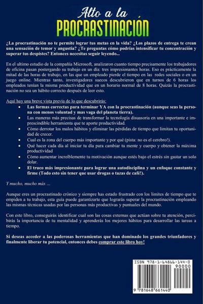 La procrastinación no te permite lograr tus metas en la vida? ¿Los plazos de entrega te crean una sensación de temor y angustia? ¿Te preguntas cómo podrías intensificar tu concentración y superar tus despistes? Entonces necesitas seguir leyendo...En el ultimo estudio de la compañía Microsoft, analizaron cuanto tiempo precisamente los trabajadores de oficina pasan postergando su trabajo en un día: tres impresionantes horas. Eso es prácticamente la mitad de las horas de trabajo, en las que un empleado pierde el tiempo en las redes sociales o en un juego online. Mientras tanto, investigadores suecos descubrieron que en turnos de 6 horas los empleados tenían la misma productividad que en un horario normal de 8 horas. Quizás la procrastinación no sea un hábito correcto después de leer esto. Aquí hay una breve vista previa de lo que descubrirás:Las formas correctas para terminar YA con la procrastinación (aunque seas la persona con menos voluntad y mas vaga del planeta tierra). Las maneras más precisas de transformar la tecnología disuasoria en una importante e imprescindible herramienta que te aporte productividad. Cómo derrotar los malos hábitos y eliminar las pérdidas de tiempo que limitan tu oportunidad de crecer. Cual es la zona del cuerpo más importante y por qué (pista: no es el cerebro!). Qué hacer cada día al iniciar tu día para cambiar tu mente y cuerpo y obtener la máxima productividad Cómo aumentar increíblemente tu motivación aunque estés bajo el estrés sin gastar un solo dolar. El truco más impresionante para lograr una autodisciplina y un enfoque constante y firme (Todo esto sin tener que usar drogas o tazas de café!). Y mucho, mucho más ...Aunque eres un procrastinado crónico y siempre has estado frustrado con los limites de tiempo que te empiden a tu trabajo, esta guía puede garantizarte que lograrás superar la procrastinación empleando las mismas técnicas usadas por las personas más productivas y puntuales del mundo. Con este libro, conseguirás identificar cual son las cosas externas que actúan sobre tu atención, percibirás la importancia de tu mentalidad y aprenderás los mejores hábitos para desarrollar las tareas a tiempo.Si deseas acceder a las poderosas herramientas que han dominado los grandes triunfadores y finalmente liberar tu potencial, entonces debes comprar este libro hoy!