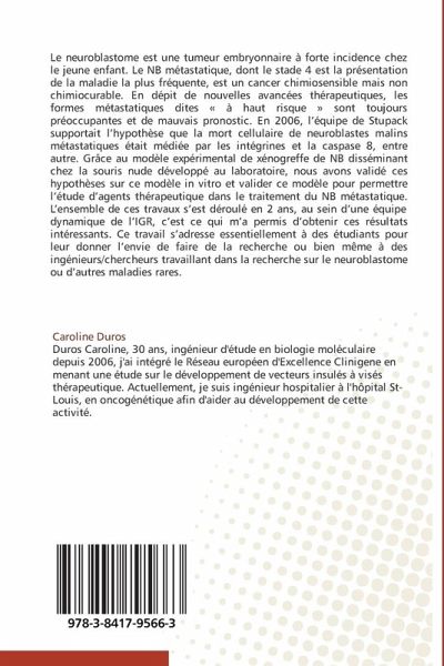 Le neuroblastome est une tumeur embryonnaire à forte incidence chez le jeune enfant. Le NB métastatique, dont le stade 4 est la présentation de la maladie la plus fréquente, est un cancer chimiosensible mais non chimiocurable. En dépit de nouvelles avancées thérapeutiques, les formes métastatiques dites " à haut risque " sont toujours préoccupantes et de mauvais pronostic. En 2006, l équipe de Stupack supportait l hypothèse que la mort cellulaire de neuroblastes malins métastatiques était médiée par les intégrines et la caspase 8, entre autre. Grâce au modèle expérimental de xénogreffe de NB disséminant chez la souris nude développé au laboratoire, nous avons validé ces hypothèses sur ce modèle in vitro et valider ce modèle pour permettre l étude d agents thérapeutique dans le traitement du NB métastatique. L ensemble de ces travaux s est déroulé en 2 ans, au sein d une équipe dynamique de l IGR, c est ce qui m a permis d obtenir ces résultats intéressants. Ce travail s adresse essentiellement à des étudiants pour leur donner l envie de faire de la recherche ou bien même à des ingénieurs/chercheurs travaillant dans la recherche sur le neuroblastome ou d autres maladies rares.