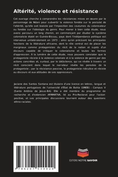 Cet ouvrage cherche à comprendre les résistances mises en oeuvre par le personnage de Ndani pour subvertir la violence fondée sur le postulat de l'altérité, qu'elle soit biaisée par l'imposition des coutumes du colonisateur ou fondée sur l'idéologie du genre. Pour mener à bien cette étude, nous avons parcouru un long chemin, en commençant par étudier le système colonialiste établi en Guinée-Bissau, pays dont l'indépendance politique est intervenue unilatéralement en 1973 ; ainsi qu'en précisant les principales fonctions de la littérature africaine, dont le rôle central est de placer les marginaux comme protagonistes du récit de la nation et sujets d'un discours capable de critiquer le colonialisme et toutes les formes d'oppression. À la lumière de cette étude, nous pouvons constater que la protagoniste résiste à la violence coloniale et à la violence de genre par des actions concrètes et, surtout, par le (dé)silence, qui se révèle à travers un récit conscient dans lequel le narrateur révèle les pensées de la protagoniste ; par la résistance passive, la protagoniste ridiculise et résiste au discours et aux attitudes de ses oppresseurs.