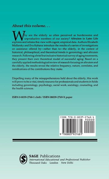 The productive contribution by older adults to the lives of others through altruism and helping is the focus of this book, which provides a useful antidote to the view that the elderly are recipients rather than givers of help. Following a brief historical survey of ageing treatments, the authors present their own theoretical model of successful ageing. Based on a carefully applied methodological review of research focusing on altruism and the elderly, the results reveal the relative frequency, nature, correlates and ramifications of the contributions they make.