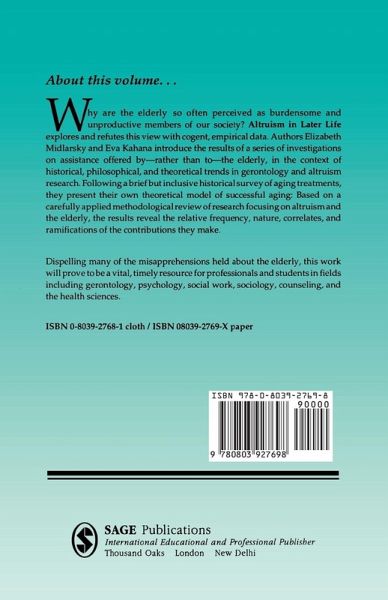 The productive contribution by older adults to the lives of others through altruism and helping is the focus of this book, which provides a useful antidote to the view that the elderly are recipients rather than givers of help. Following a brief historical survey of ageing treatments, the authors present their own theoretical model of successful ageing. Based on a carefully applied methodological review of research focusing on altruism and the elderly, the results reveal the relative frequency, nature, correlates and ramifications of the contributions they make.