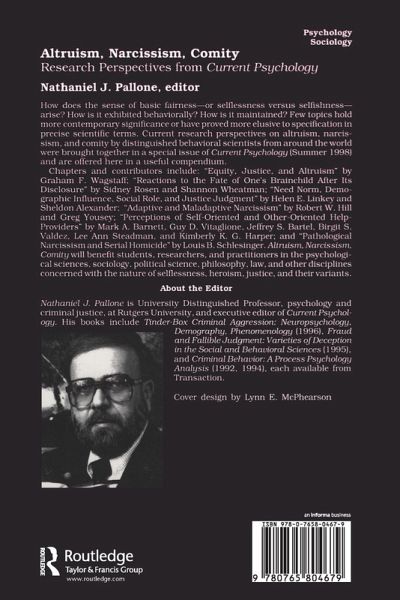 How does the sense of basic fairness--or selflessness versus selfishness--arise? How is it exhibited behaviorally? How is it maintained? Few topics hold more contemporary significance or have proved more elusive to specification in precise scientific terms. Current research perspectives on altruism, narcissism, and comity by distinguished behavioral scientists from around the world were brought together in a special issue of Current Psychology (Summer 1998) and are offered here in a useful compendium. Chapters and contributors include: "Equity, Justice, and Altruism" by Graham F. Wagstaff; "Reactions to the Fate of One's Brainchild After Its Disclosure" by Sidney Rosen and Shannon Wheatman; "Need Norm, Demographic Influence, Social Role, and Justice Judgment" by Helen E. Linkey and Sheldon Alexander; "Adaptive and Maladaptive Narcissism" by Robert W. Hill and Greg Yousey; "Perceptions of Self-Oriented and Other-Oriented Help-Providers" by Mark A. Barnett, Guy D. Vitaglione, Jeffrey S. Bartel, Birgit S. Valdez, Lee Ann Steadman, and Kimberly K. G. Harper; and "Pathological Narcissism and Serial Homicide" by Louis B. Schlesinger. Altruism, Narcissism, Comity will benefit students, researchers, and practitioners in the psychological sciences, sociology, political science, philosophy, law, and other disciplines concerned with the nature of selflessness, heroism, justice, and their variants.