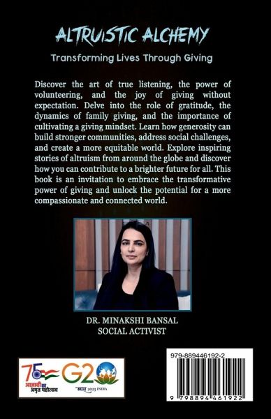 In Altruistic Alchemy, explore the profound impact of giving on individuals, communities, and the world, drawing inspiration from the author's personal experiences and insights gleaned from a rich cultural heritage. Discover the art of true listening, the power of volunteering, and the joy of giving without expectation. Delve into the role of gratitude, the dynamics of family giving, and the importance of cultivating a giving mindset. Learn how generosity can build stronger communities, address social challenges, and create a more equitable world. Explore inspiring stories of altruism from around the globe and discover how you can contribute to a brighter future for all. This book is an invitation to embrace the transformative power of giving and unlock the potential for a more compassionate and connected world. In Altruistic Alchemy, explore the profound impact of giving on individuals, communities, and the world, drawing inspiration from the author's personal experiences and insights gleaned from a rich cultural heritage.