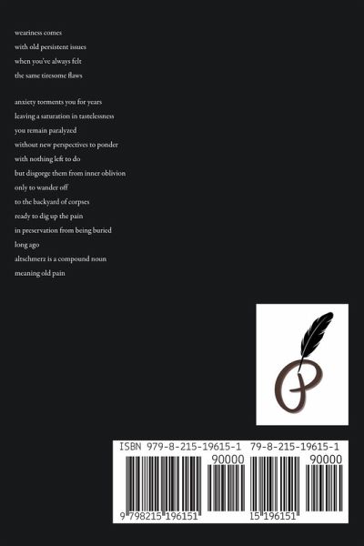 "...anxiety torments you for years, leaving a saturation in tastelessness you remain paralyzed without new perspectives to ponder, with nothing left to do but disgorge them from inner oblivion, only to wander off to the backyard of corpses, ready to dig up the pain in preservation from being buried long ago. Altschmerz is a compound noun meaning old pain." In this creative book of prose, you will uncover difficult expressions about domestic relationships, friendships, childhood trauma, fear and abuse that will stimulate perspectives towards courage and higher self-esteem. Sensitive but tough. Do you have what it takes to grow in perseverance?