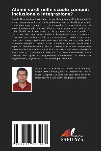 Questo libro analizza il processo che un alunno sordo affronta durante le lezioni di matematica in una scuola tradizionale, sia che si tratti di inclusione che di integrazione. L'autore cerca di comprendere le concezioni storiche dei sordi, di abituarsi alle principali differenze tra inclusione e integrazione per poter identificare il processo che lo studente sta attraversando. Le discussioni, che hanno come riferimento la normativa vigente, sono state l'occasione per verificare se le proposte in essa contenute sono state rispettate o meno e come sono state recepite nella teoria e nella pratica all'interno dell'unità scolastica. Il testo intende evidenziare diversi aspetti importanti che devono essere rivisti in relazione all'inclusione delle persone sorde nelle scuole tradizionali, mostrando la necessità di sviluppare diverse azioni affinché l'istruzione secondaria in una scuola tradizionale possa diventare uno spazio di insegnamento-apprendimento che soddisfi le esigenze visive, linguistiche e culturali delle persone sorde.