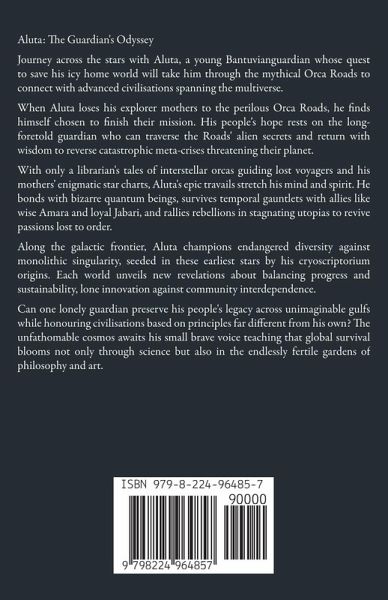 Aluta: The Guardian's Odyssey Journey across the stars with Aluta, a young Bantuvianguardian whose quest to save his icy home world will take him through the mythical Orca Roads to connect with advanced civilisations spanning the multiverse. When Aluta loses his explorer mothers to the perilous Orca Roads, he finds himself chosen to finish their mission. His people's hope rests on the long-foretold guardian who can traverse the Roads' alien secrets and return with wisdom to reverse catastrophic meta-crises threatening their planet. With only a librarian's tales of interstellar orcas guiding lost voyagers and his mothers' enigmatic star charts, Aluta's epic travails stretch his mind and spirit. He bonds with bizarre quantum beings, survives temporal gauntlets with allies like wise Amara and loyal Jabari, and rallies rebellions in stagnating utopias to revive passions lost to order. Along the galactic frontier, Aluta champions endangered diversity against monolithic singularity, seeded in these earliest stars by his cryoscriptorium origins. Each world unveils new revelations about balancing progress and sustainability, lone innovation against community interdependence. Can one lonely guardian preserve his people's legacy across unimaginable gulfs while honouring civilisations based on principles far different from his own? The unfathomable cosmos awaits his small brave voice teaching that global survival blooms not only through science but also in the endlessly fertile gardens of philosophy and art.