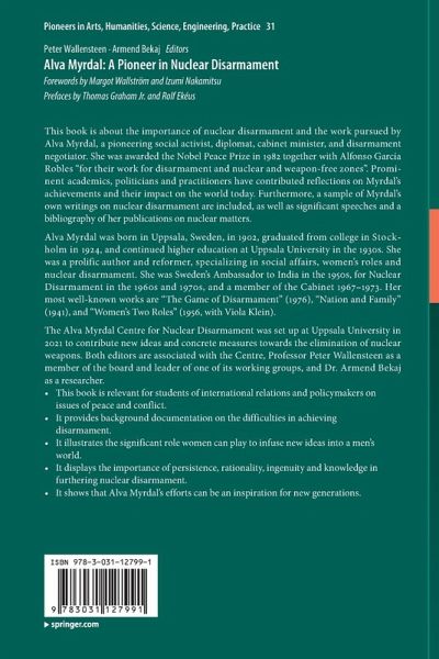 This book is about the importance of nuclear disarmament and the work pursued by Alva Myrdal, a pioneering social activist, diplomat, cabinet minister, and disarmament negotiator. She was awarded the Nobel Peace Prize in 1982 together with Alfonso García Robles "for their work for disarmament and nuclear and weapon-free zones". Prominent academics, politicians and practitioners have contributed reflections on Myrdal's achievements and their impact on the world today. Furthermore, a sample of Myrdal's own writings on nuclear disarmament are included, as well as significant speeches and a bibliography of her publications on nuclear matters.