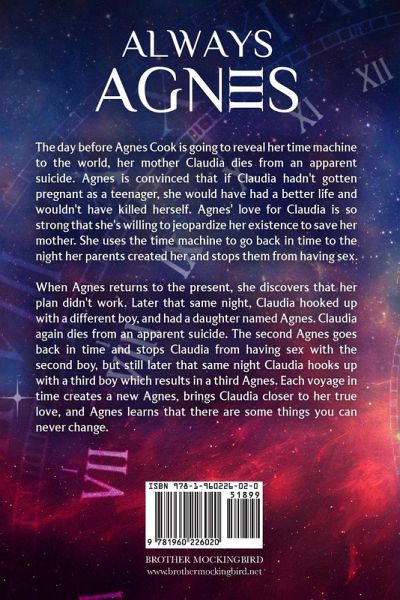The day before Agnes Cook is going to reveal her time machine to the world, her mother Claudia dies from an apparent suicide. Agnes is convinced that if Claudia hadn't gotten pregnant as a teenager, she would have had a better life and wouldn't have killed herself. Agnes' love for Claudia is so strong that she's willing to jeopardize her existence to save her mother. She uses the time machine to go back in time to the night her parents created her and stops them from having sex. When Agnes returns to the present, she discovers that her plan didn't work. Later that same night, Claudia hooked up with a different boy, and had a daughter named Agnes. Claudia again dies from an apparent suicide. The second Agnes goes back in time and stops Claudia from having sex with the second boy, but still later that same night Claudia hooks up with a third boy which results in a third Agnes. Each voyage in time creates a new Agnes and brings Claudia closer to her true love. Soon, Agnes learns that there are some things you can never change.
