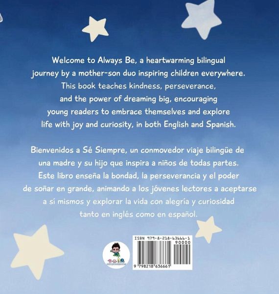 Welcome to Always Be, a heartwarming bilingual journey by a mother-son duo inspiring children everywhere. This book teaches kindness, perseverance, and the power of dreaming big, encouraging young readers to embrace themselves and explore life with joy and curiosity in both English and Spanish. Through charming storytelling and vibrant illustrations, we ignite imaginations and foster positivity and resilience. Join us on a journey where every moment is an opportunity to grow, learn, and shine. Let's celebrate the magic of being you! ---- Bienvenidos a Sé Siempre, un conmovedor viaje bilingüe de una madre y su hijo que inspira a niños de todas partes. Este libro enseña la bondad, la perseverancia y el poder de soñar en grande, animando a los jóvenes lectores a aceptarse a sí mismos y explorar la vida con alegría y curiosidad tanto en inglés como en español. A través de encantadoras historias e ilustraciones vibrantes, despertamos la imaginación y cultivamos la positividad y la resiliencia. Únanse a nosotros en un viaje donde cada momento es una oportunidad para crecer, aprender y brillar. ¡Celebremos juntos la magia de ser tú mismo!