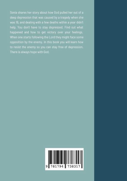 Sonia shares her story about how God pulled her out of a deep depression that was caused by a tragedy at 16 years old and dealing with a few deaths within a year didn't help. You don't have to stay depressed. Find out what happened. When one starts following the Lord they might face some opposition by the enemy. In this book you will learn how to resist the enemy so you can stay free of depression. There is always hope when one turns to God.