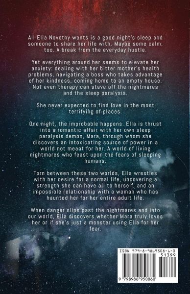 All Ella Novotny wants is a good night's sleep and someone to share her life with. Maybe some calm, too. A break from the everyday hustle. Yet everything around her seems to elevate her anxiety: dealing with her bitter mother's health problems, navigating a boss' who takes advantage of her kindness, coming home to an empty house. Not even therapy can stave off the nightmares. She never expected to find love in the most terrifying of places. One night, the improbable happens. Ella is thrust into a romantic affair with her sleep paralysis demon, Mara, through whom she discovers an intoxicating source of power in a world not meant for her. A world of living nightmares who feast upon the fears of sleeping humans. Torn between these two worlds, Ella wrestles with her desire for a normal life, uncovering a strength she can have all to herself, and an impossible relationship with a woman who has haunted her for her entire adult life. When danger slips past the nightmares and into our world, Ella discovers whether Mara truly loves her or if she's just another monster using Ella for her fear.