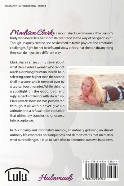 Madison Clark is a mountain of a woman in a little person's body who never lets her short stature stand in the way of her giant spirit. Though uniquely created, she has learned to tackle physical and emotional challenges, fight for her beliefs, and show others that she can do anything they can do-just in a different way. Clark shares an inspiring story about what life is like for a woman who cannot reach a drinking fountain, needs help selecting items higher than the second shelf in a store, and is towered over by a typical fourth grader. While shining a spotlight on the good, bad, and ugly aspects of living with dwarfism, Clark reveals how she has persevered through it all with a never-give-up attitude and a refusal to be excluded that ultimately transforms ignorance into acceptance. In this moving and informative memoir, an ordinary girl living an almost ordinary life embraces her uniqueness and demonstrates that no matter what our challenges, it is up to each of us to determine our own happiness.