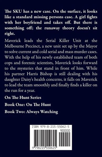 The SKU has a new case. On the surface, it looks like a standard missing persons case. A girl fights with her boyfriend and takes off. But there is something off; the runaway theory doesn't sit right. Maverick leads the Serial Killer Unit at the Melbourne Precinct, a new unit set up by the Mayor to solve current and cold serial and mass murder cases. With the help of his newly established team of both cops and forensic scientists, Maverick looks forward to the mysteries that stand in front of him. While his partner Harris Bishop is still dealing with his daughter Daisy's health concerns, it falls on Maverick to lead the team smoothly and finally finds a killer on the run for a year. On The Hunt Series Book One: On The Hunt Book Two: Always Watching All books can be read stand-alone. To read more about the Cold Case Unit and Missing Persons Unit, why not check out the series by S L Davies?